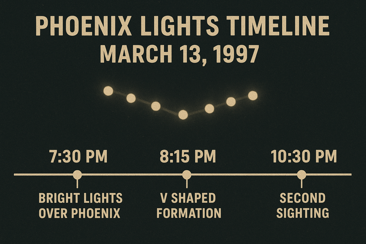 On March 13, 1997, a quiet Thursday evening in the American Southwest turned into one of the most significant UFO events ever recorded. Known today as The Phoenix Lights, this massive, multi-state sighting captivated thousands of witnesses, perplexed investigators, and spawned decades of debate among skeptics, scientists, and UFO researchers alike.